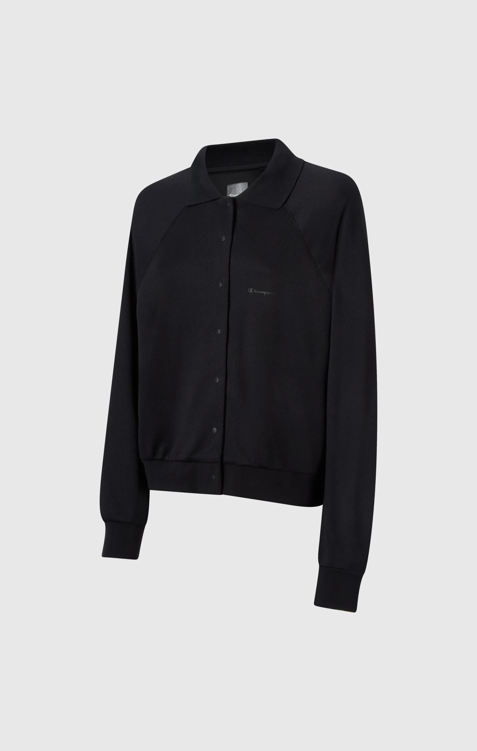 Made from a special fiber blended with a high concentration of nano-sized ceramic particles, this snap cardigan is designed to deliver functional comfort. The fabric offers a soft and smooth hand feel, along with stretch, excellent stretch recovery, and quick-drying properties, ensuring comfortable wear. The ceramics integrated into the fibers provide UV-cut performance to help reduce damage to the skin, while also effectively blocking infrared rays to isolate external heat. At the same time, the enhanced thermal conductivity of the fibers helps suppress the rise of internal garment temperature, maintaining a lasting cooling effect even in hot summer conditions. The cardigan features a relaxed fit with added room in the body and armholes. While minimal in appearance, it incorporates distinctive cutting with three-dimensional pattern pieces from the shoulders through the sleeves and along both sides, allowing for an increased range of arm movement. The front is finished with snap buttons for easy opening and closing. A tonal matte rubber Champion® logo is printed on the left chest, and a bonded Champion® label is applied on the interior. These understated details are characteristic elements that express the minimal and refined style of CHAMPION BLACK EDITION.@@@Draping |Snap Button |Matt Rubber Print |Transfer Print Name Label |Composition: 100% Polyester |Weight: 220 g/m²