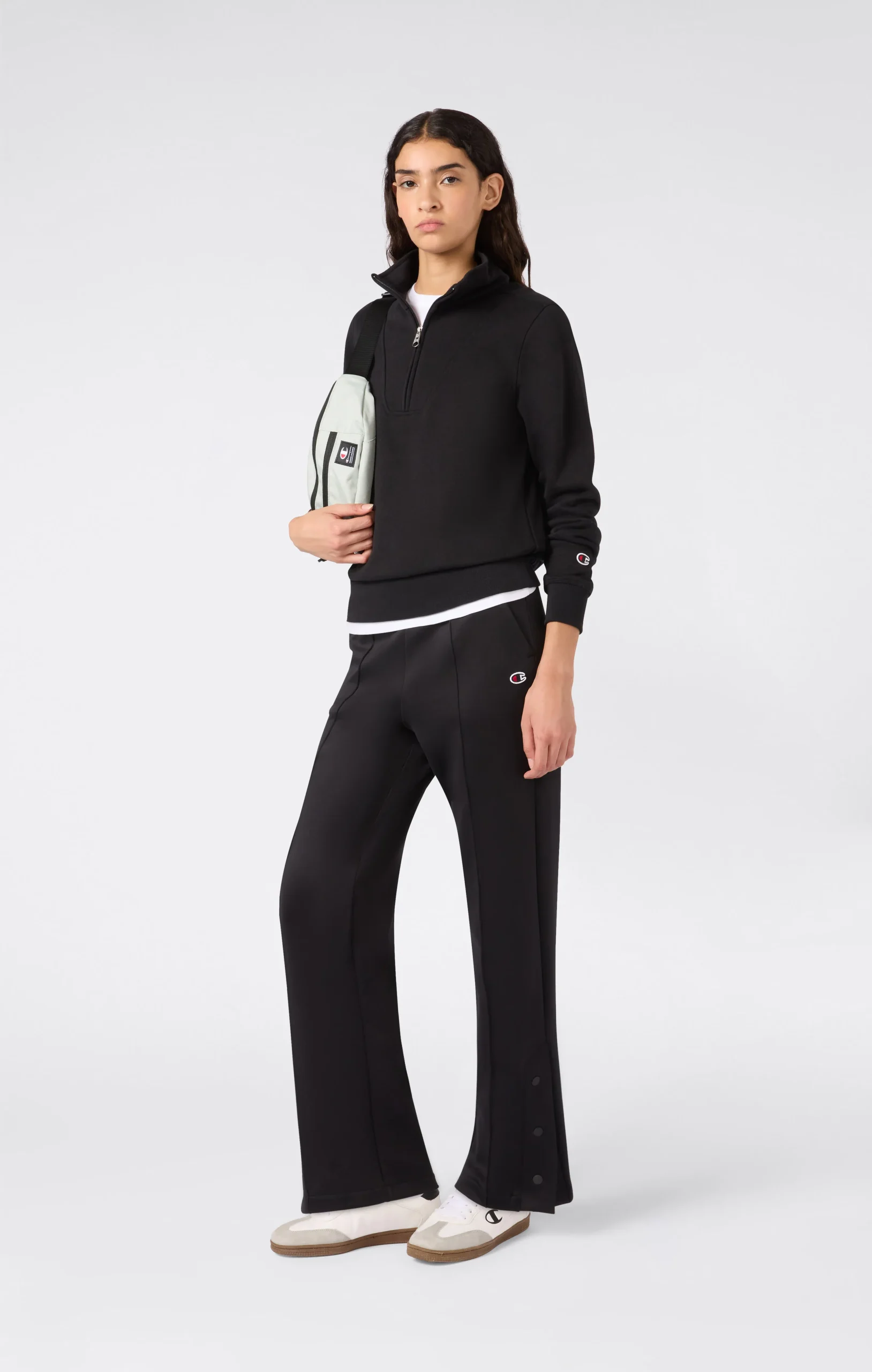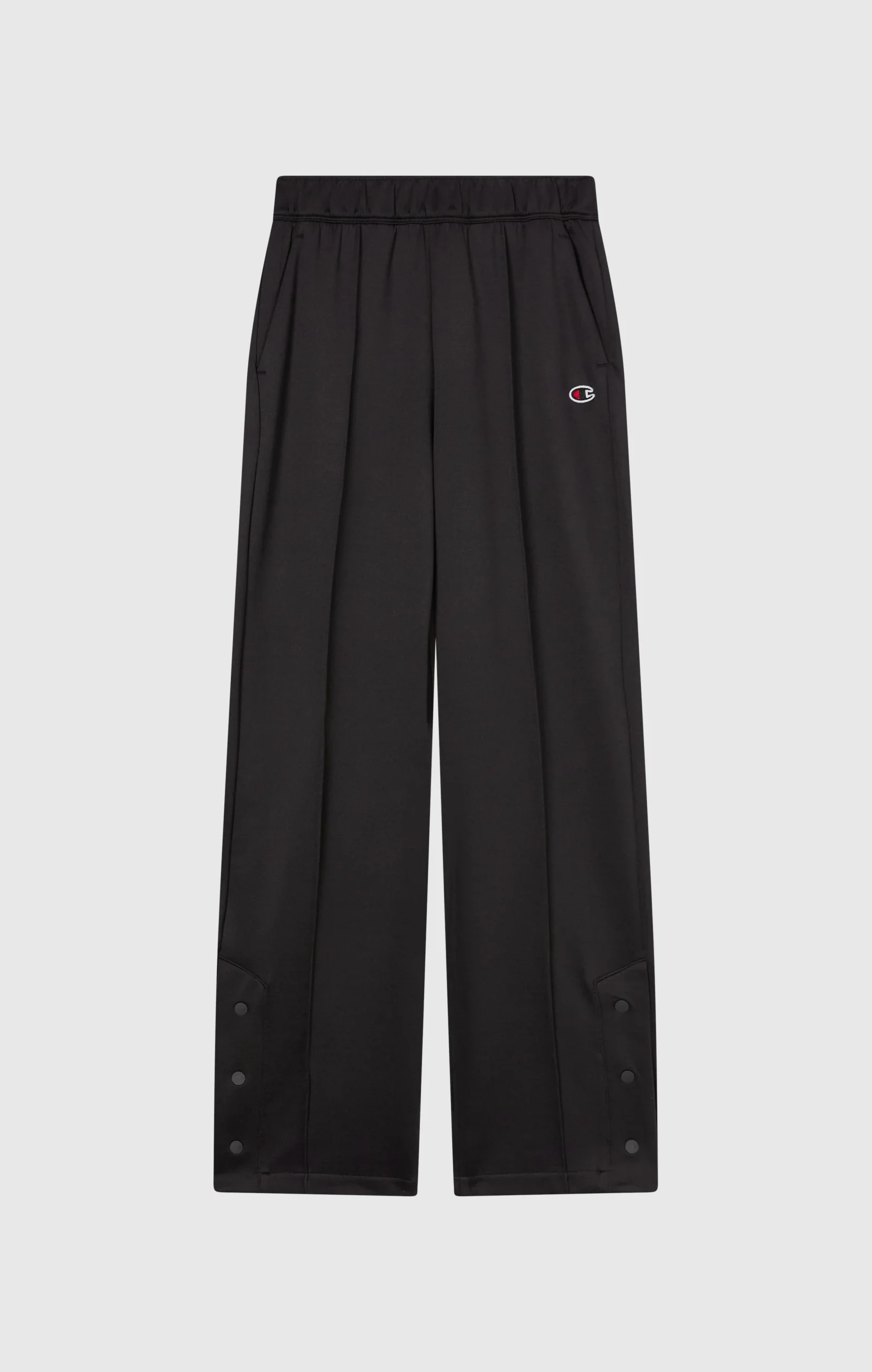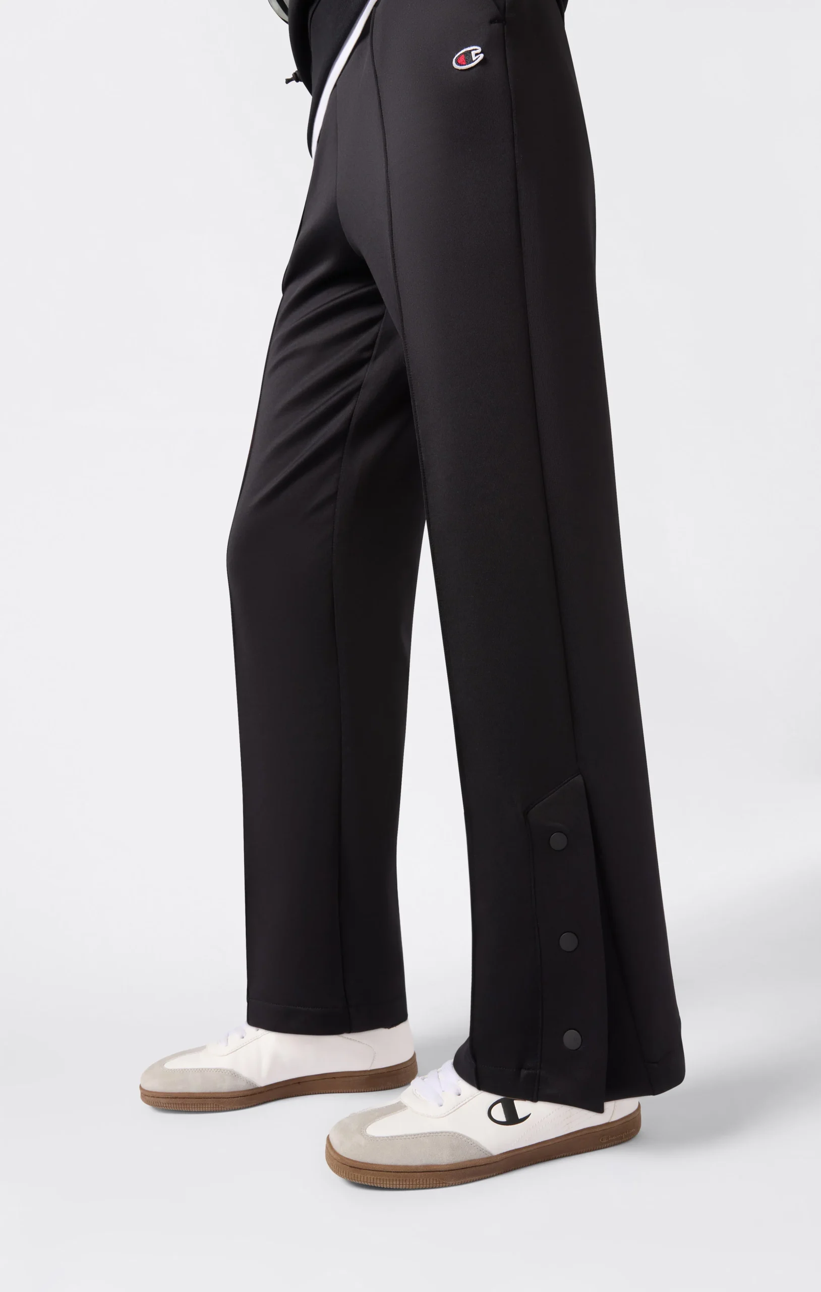 Everyday comfort and a sharp cut meet in these Icons pants. Made in matte and glossy interlock, they feature a side slit at the cuff closed by buttons, adding an extra touch of femininity and style. The elastic waistband guarantees a comfortable fit, while the embroidered C logo adds an authentic accent.@@@Fabric: Shiny and matte interlock – 265 g/m² |Composition: 50% Cotton, 43% Polyester, 7% Elastane |Leg hem with side slit and buttons |Elasticated waistband |Embroidered C logo |Fit: Standard Fit – soft and comfortable