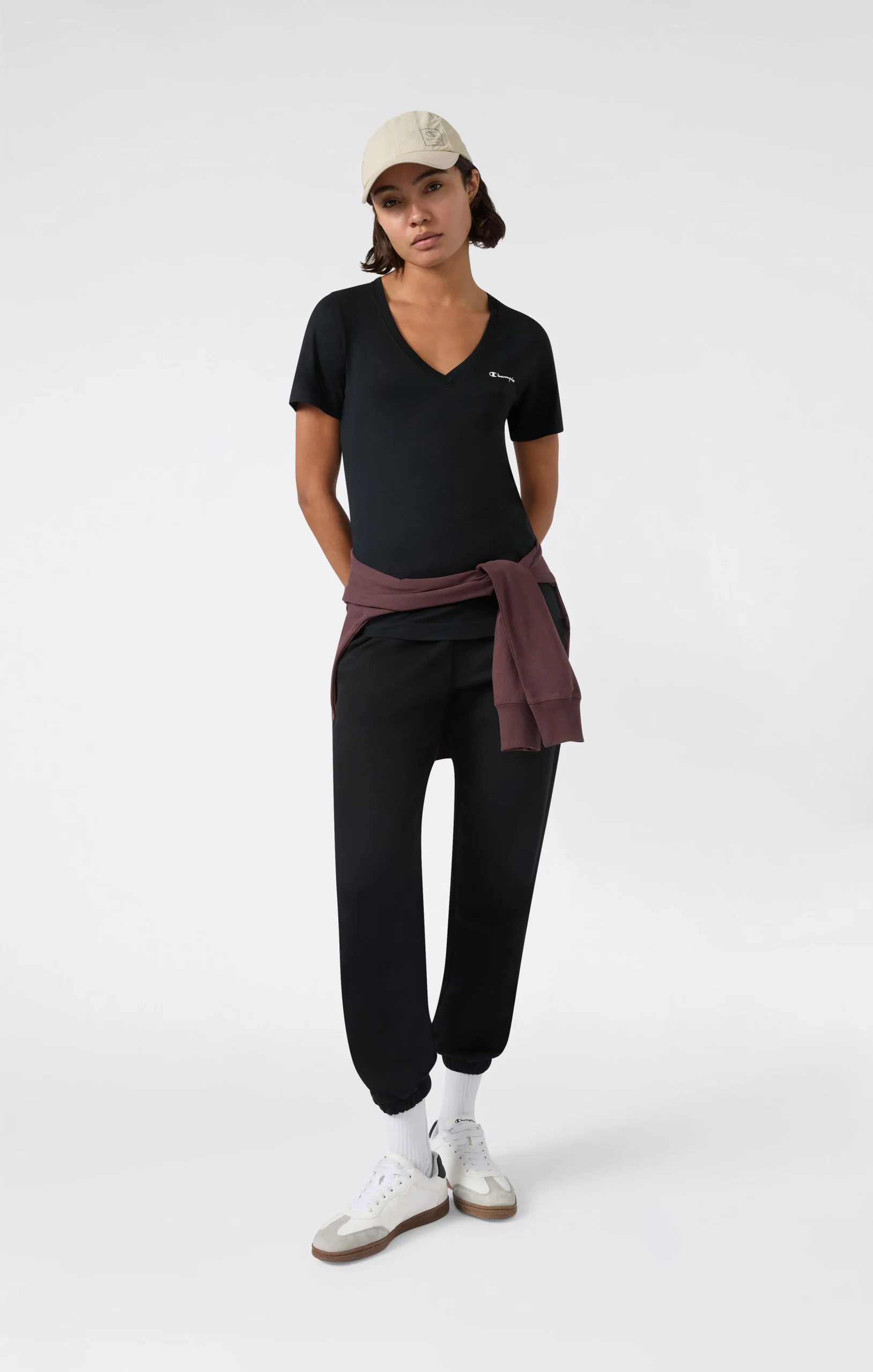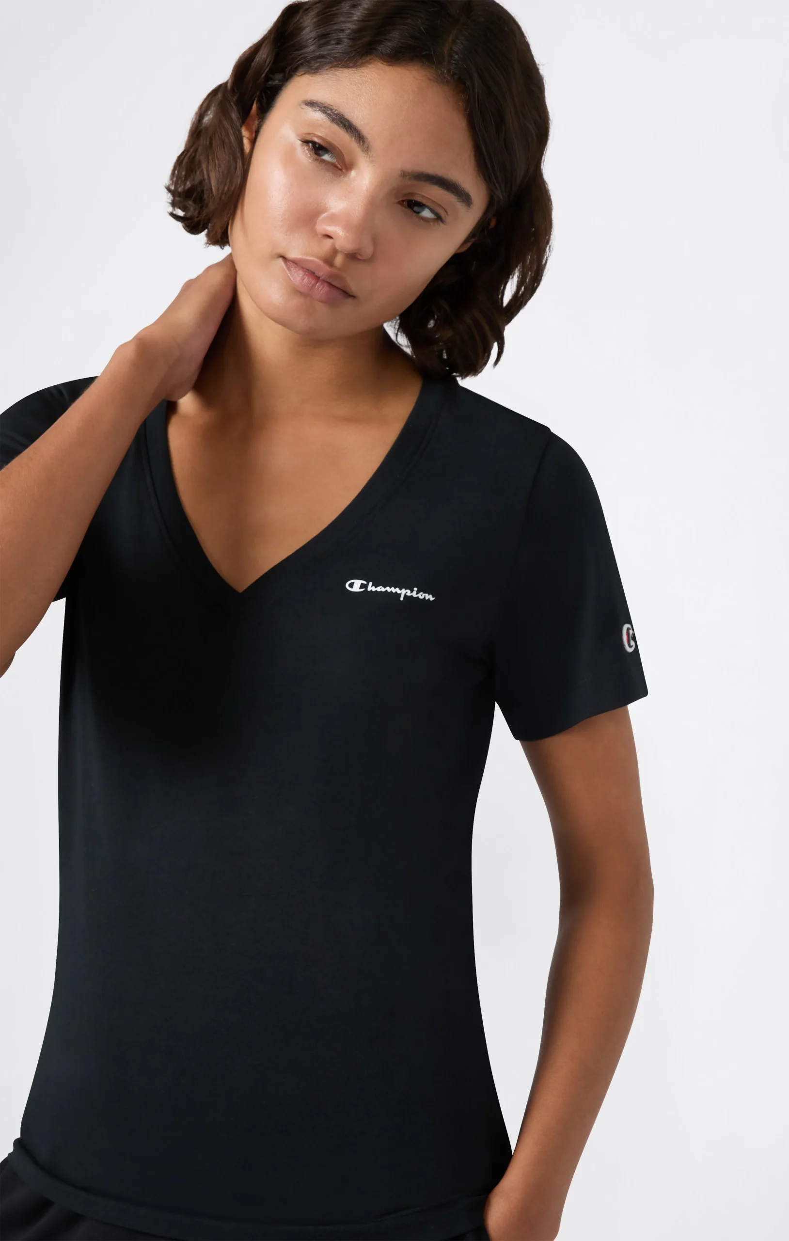 Essential and versatile, this women’s T-shirt from the Icons line is made from lightweight and comfortable Athletic combed cotton jersey. The V-neck design enhances the neckline while maintaining a clean, minimal look. The Slim fit follows the silhouette naturally, making it ideal for everyday wear and effortless casual style, finished with an embroidered Champion logo on the chest.@@@Fit: Slim, close-fitting without being tight, follows the silhouette |Fabric: Athletic Jersey Combed |Composition: 100% Cotton |Weight: 180 g/m² |V-neck |Short sleeves |Clean, essential design |Straight hem |Embroidered Champion logo on chest