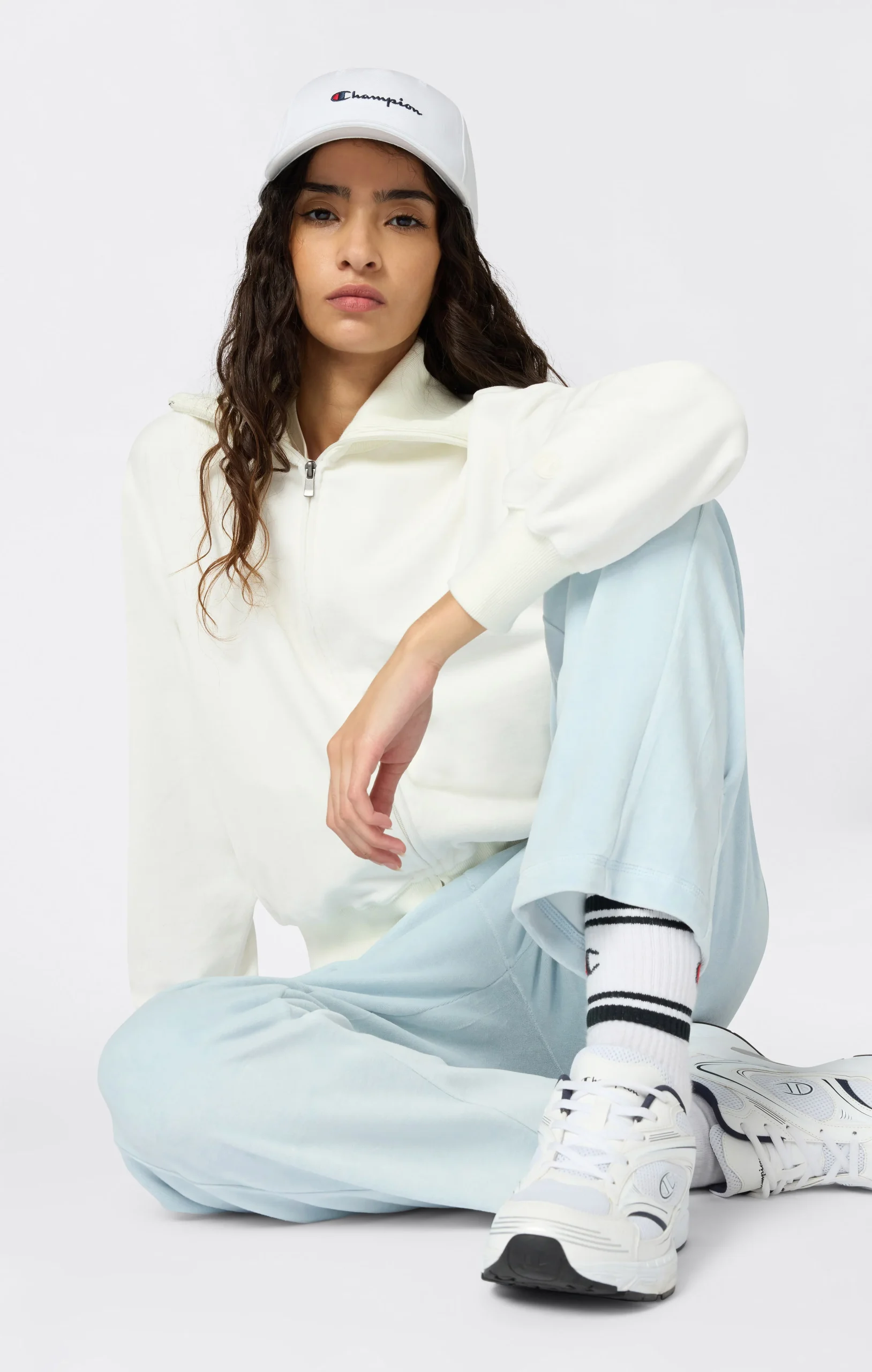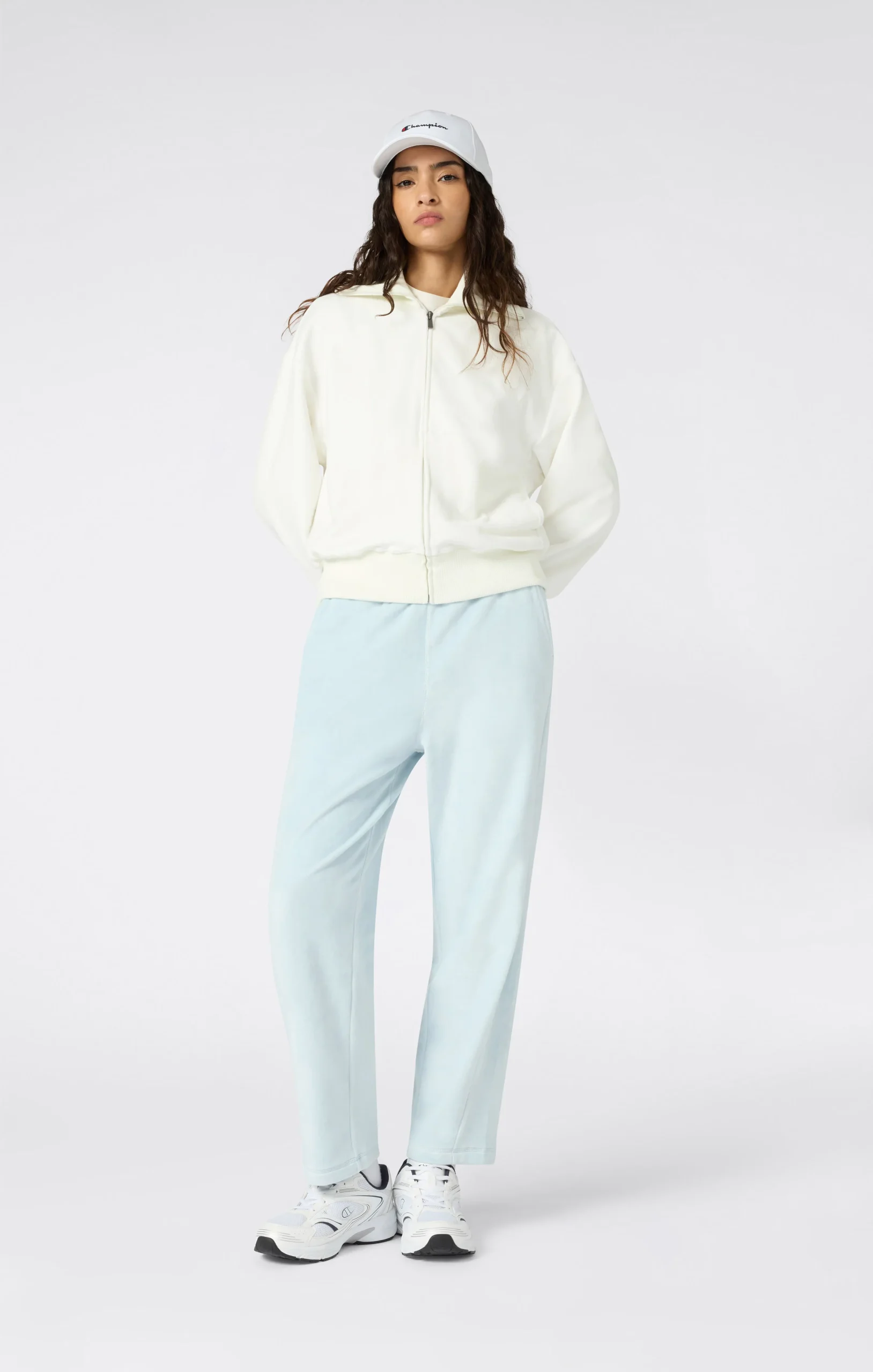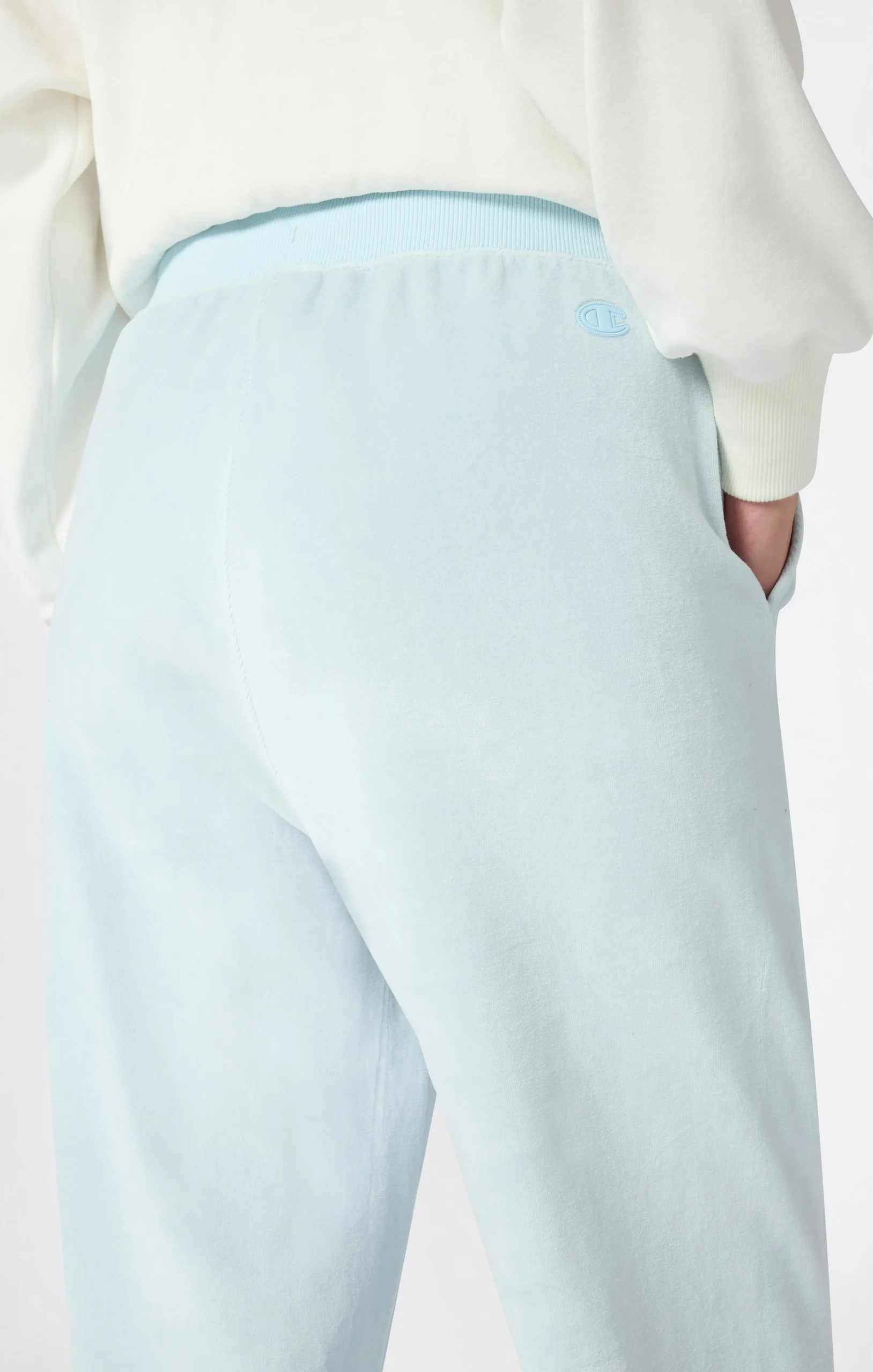These velvet trousers combine softness, comfort, and a relaxed feminine style. The ribbed elastic waistband ensures a secure and defined fit, while the slightly tapered leg naturally flatters the figure. Front pockets complete the look. The smooth, velvety fabric feels pleasant to the touch, making this piece perfect for elegant moments of relaxation—whether at home or out and about.@@@Fabric: Heavy stretch velvet, 360 g/m² |Composition: 75% Cotton, 23% Polyester, 2% Elastane |Fluid, soft and flexible fabric |Ribbed elastic waistband |Side pockets |Fit: Standard Fit: Versatile and comfortable fit with standard width and length.