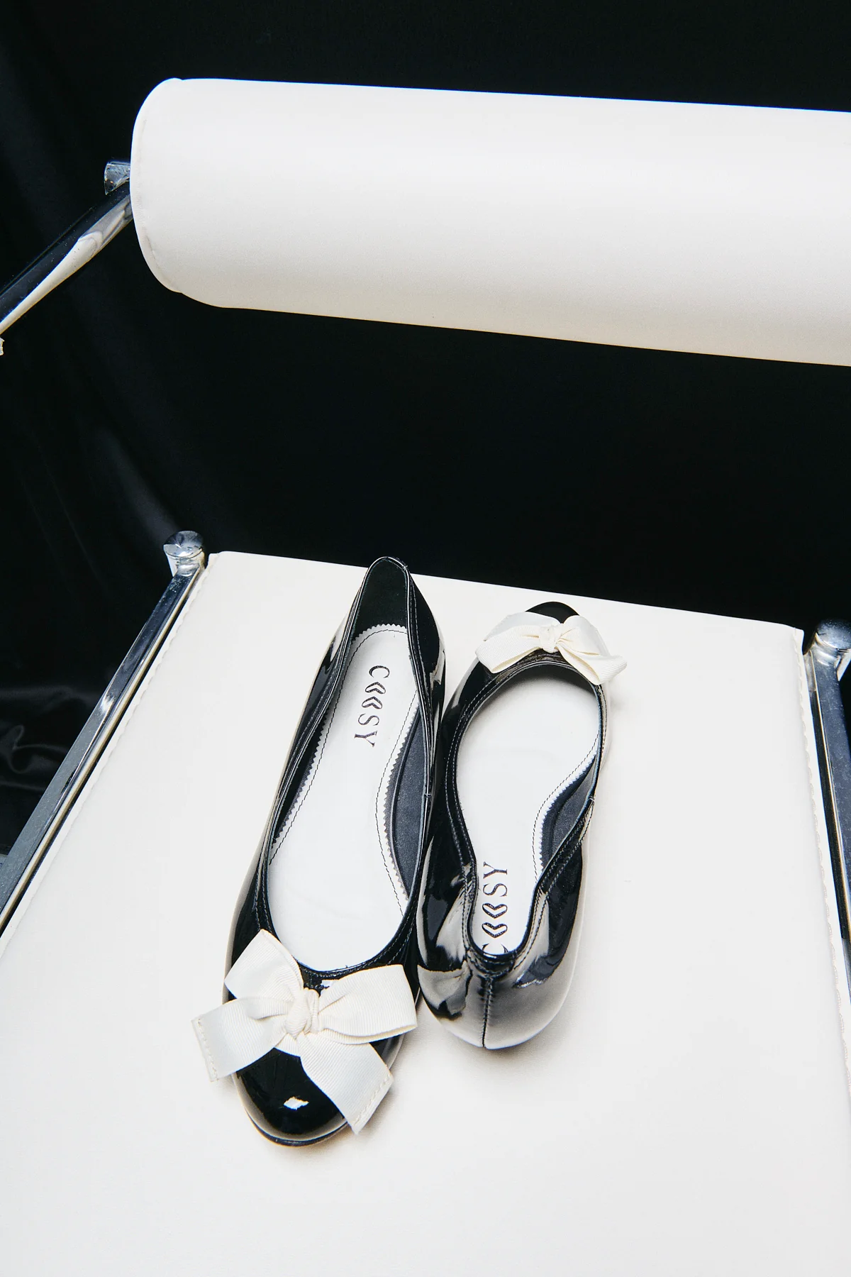 El zapato Seraphine negro de Coosy reinventa la bailarina clásica con un diseño sofisticado y femenino. Confeccionado en acabado efecto charol brillante, este zapato plano destaca por su puntera redondeada y el delicado lazo en contraste que aporta un toque romántico y atemporal.