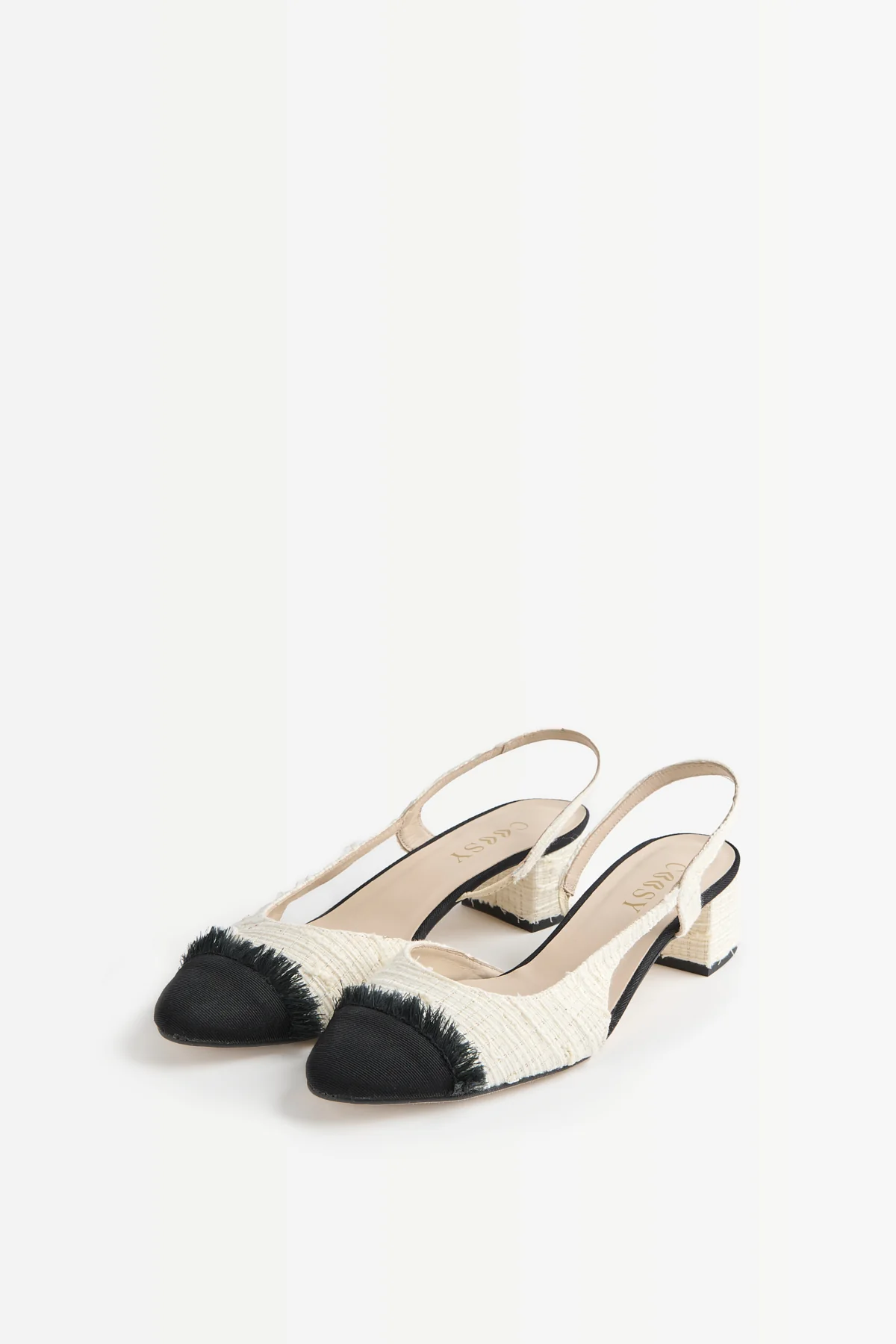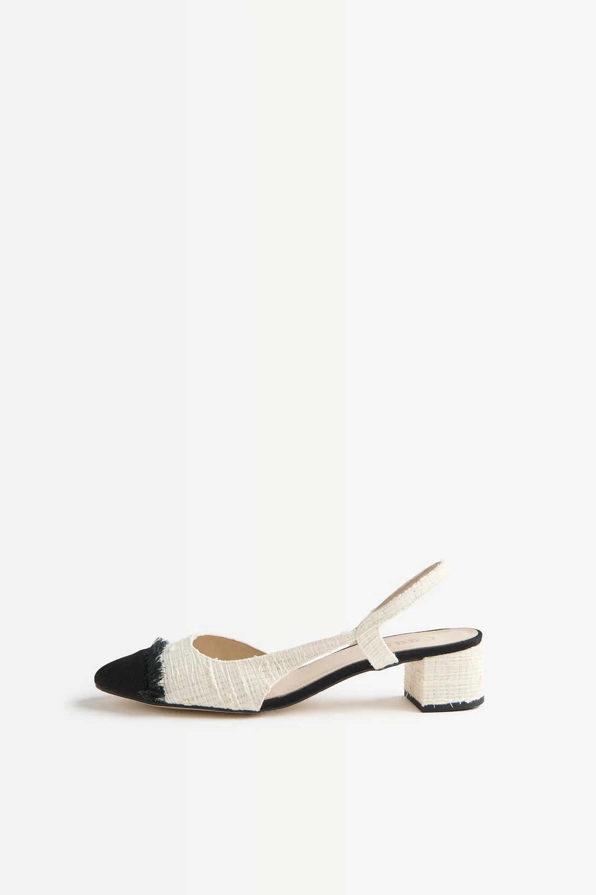 El zapato tweed blanco de Coosy es un slingback femenino y sofisticado que combina elegancia clásica con un toque contemporáneo. Confeccionado en tejido tweed blanco, destaca por su puntera en contraste en color negro, un detalle que aporta carácter y un aire atemporal inspirado en la estética parisina.